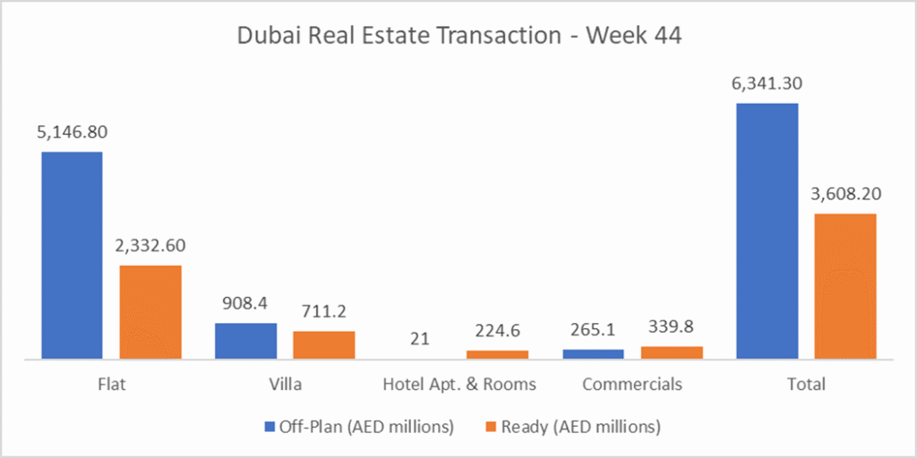 The total real estate transactions in Dubai for Week 44 was AED 9.95 billion and 5,225 transactions. Off-plan contributed 63.7% or 6.34 billion, while Ready properties contributed 36.3% or 3.61 billion.