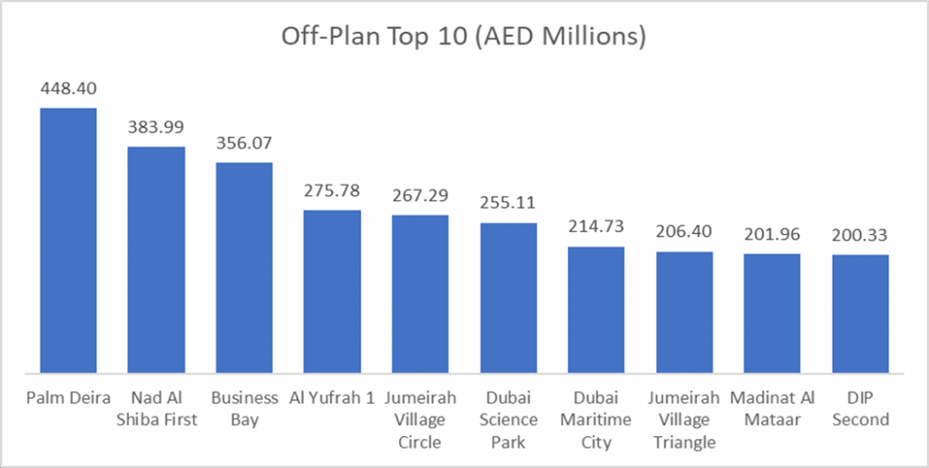 Palm Deira and Nad Al Shiba First together cleared more than AED 800 million in off-plan value, signalling intense absorption in large-scale masterplan launches. JVC continue to act as volume engines for investors targeting mid-ticket stock with rental yield stories.