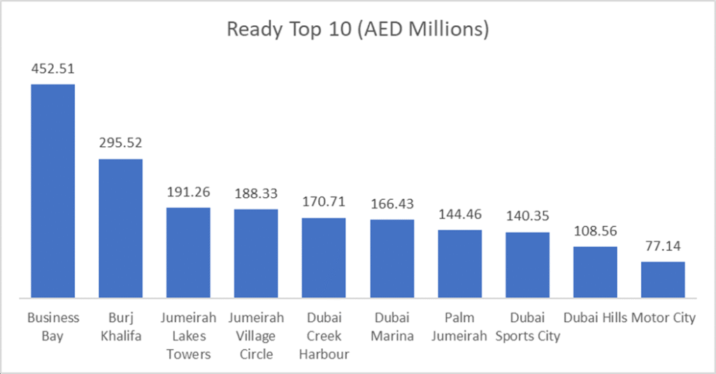 The ready market remains highly concentrated in core high-rise investment districts. Business Bay, Downtown (Burj Khalifa), and JLT alone accounted for well over AED 900 million in secondary activity, reinforcing central Dubai towers as highly liquid assets. JVC’s presence in both off-plan and ready tables shows it is a dual-market hub for investors: pre-handover and immediate rental stock.