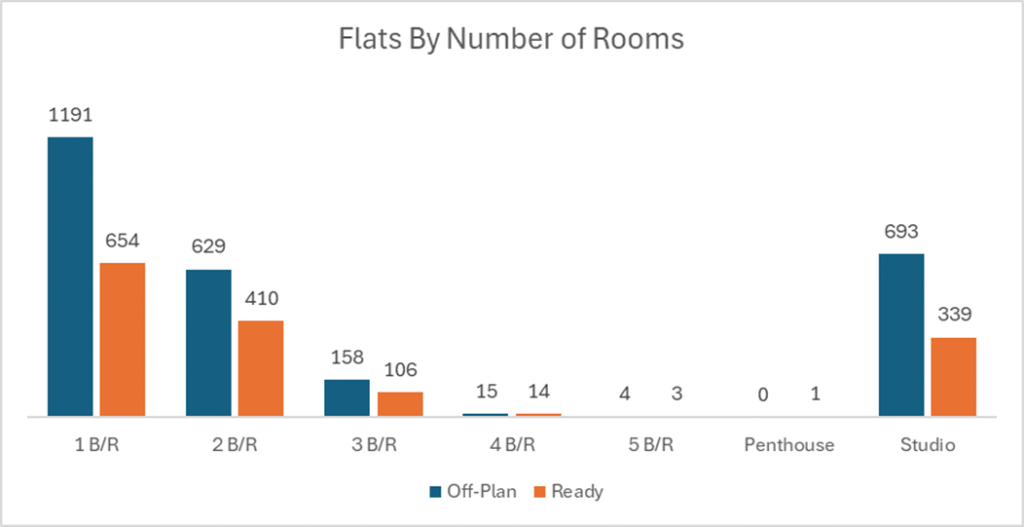 Off-Plan is still the main engine at 63.7% of total value, with flats alone representing 81.2% of that segment. Ready deals remain dominated by high-rise apartments in Business Bay, Downtown, JLT, Marina, and JVC, confirming that investors are still comfortable recycling capital into dense rental stock.