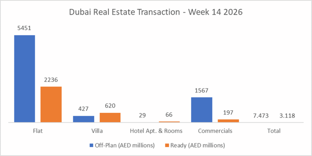 Week 14 was a strong rebound week, with both value and transaction count moving higher. The structure of the market remained familiar in one sense, off-plan still dominated overall activity, but the internal composition of the week was more interesting than a routine off-plan surge. First, off-plan was driven not just by flats, but also by an unusually large commercial contribution. Second, the ready segment showed real depth through mortgage-backed activity, with financing marginally exceeding outright ready sales by value. That combination suggests this was not a one-dimensional speculative week; it reflected both launch-driven appetite in off-plan and solid balance-sheet participation in ready stock.