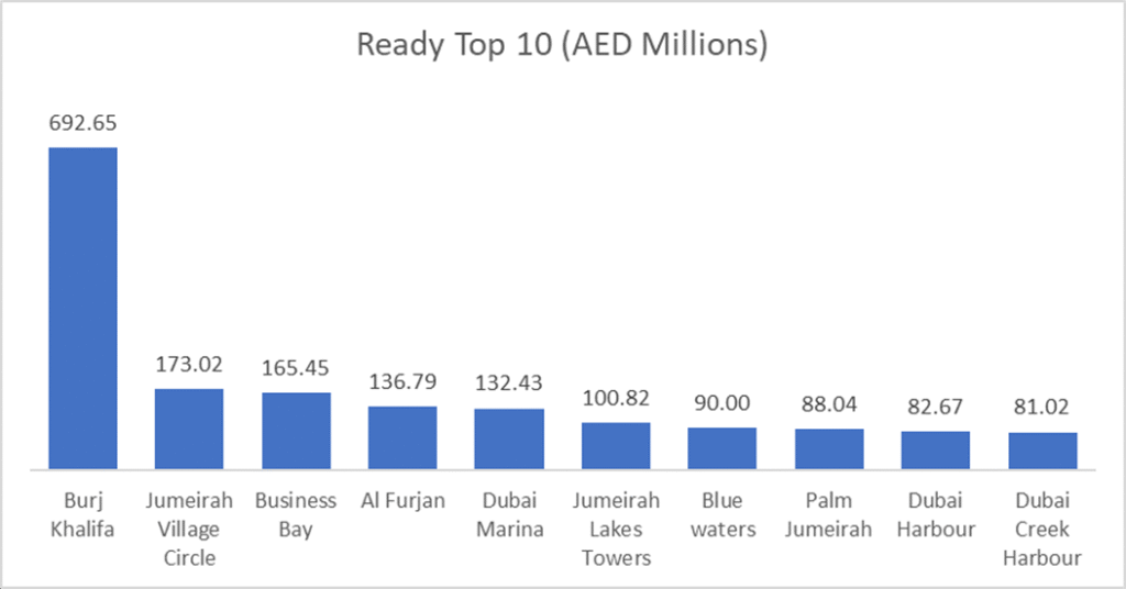 The ready market was smaller than off plan, but still substantial at more than AED 3.1 billion, with flats again dominating at 71.7% of segment value. Unlike off plan, however, the ready market showed a much more balanced mix between sales and mortgages. Mortgage transactions reached AED 1.550 billion, accounting for 49.7% of ready value, slightly ahead of Sales at AED 1.406 billion (45.1%), while Gifts contributed AED 162.6 million (5.2%). This is an important signal: the ready market this week was not driven only by transfer activity, but by financing as well. Geographically, the top 10 ready areas accounted for AED 1.743 billion, or 55.9% of ready value, with Burj Khalifa alone contributing AED 692.6 million, equal to 22.2% of the segment.