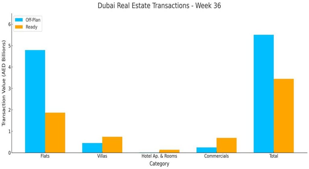 The total real estate transactions in Dubai for Week 36 was AED 8.95 billion and 4,188 transactions. Off-plan contributed 61.5% or 5.51 billion, while Ready properties contributed 38.5% or 3.45 billion.