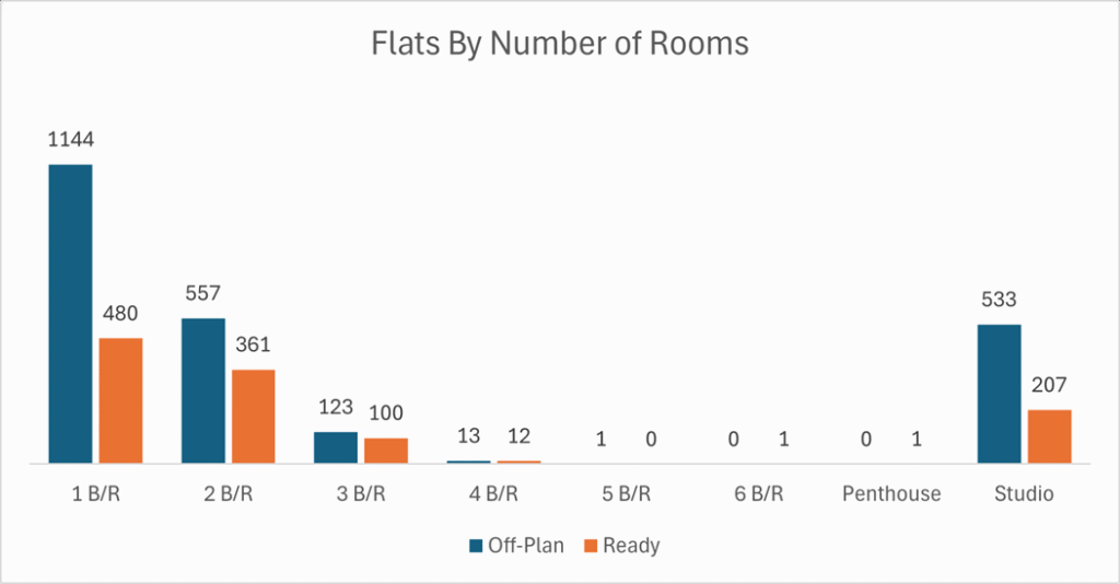 - Apartment-led dynamic: Flats continue to be the engine, 87% of off-plan and 54% of ready value, while ready commercial was notably firm at 20%.