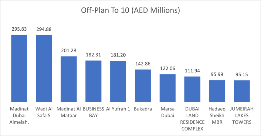 These top five areas collectively contributed AED 1.15 billion, making up 34% of total off-plan transactions.