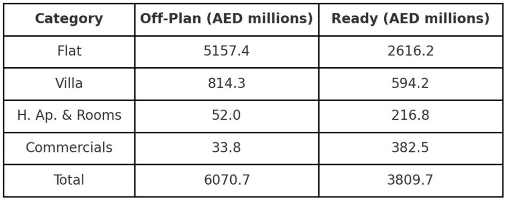 Off-plan properties contributed significantly, accounting for 61.4% of total transactions (AED 6.07 billion).