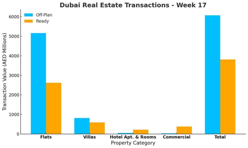 During Week 17, Dubai’s real estate market saw 4,163 transactions totaling AED 9.88 billion. Off-Plan properties led activity with AED 6.07 billion (61.4 % of total), while Ready properties contributed AED 3.81 billion (38.6 %).