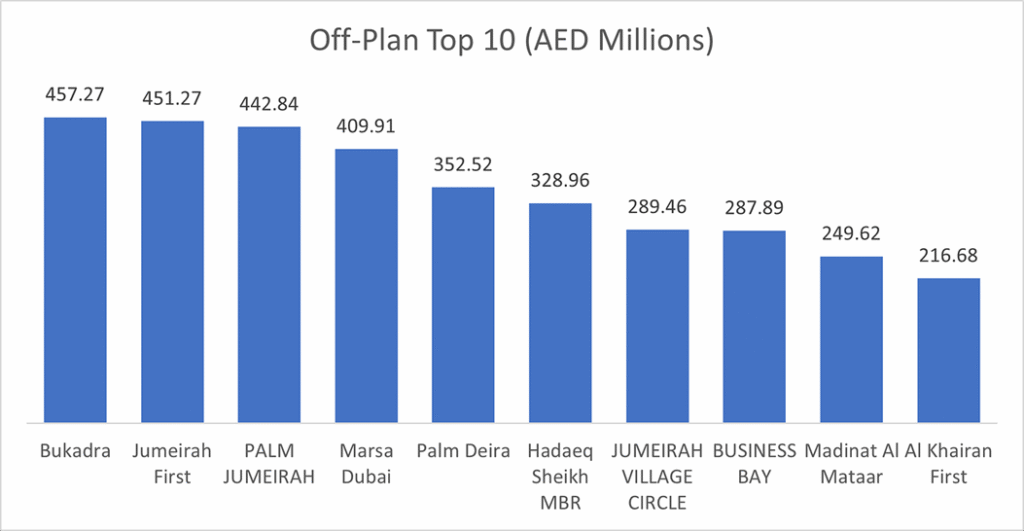 These ten locales together accounted for AED 3.49 billion (57.5% of total off-plan transactions).