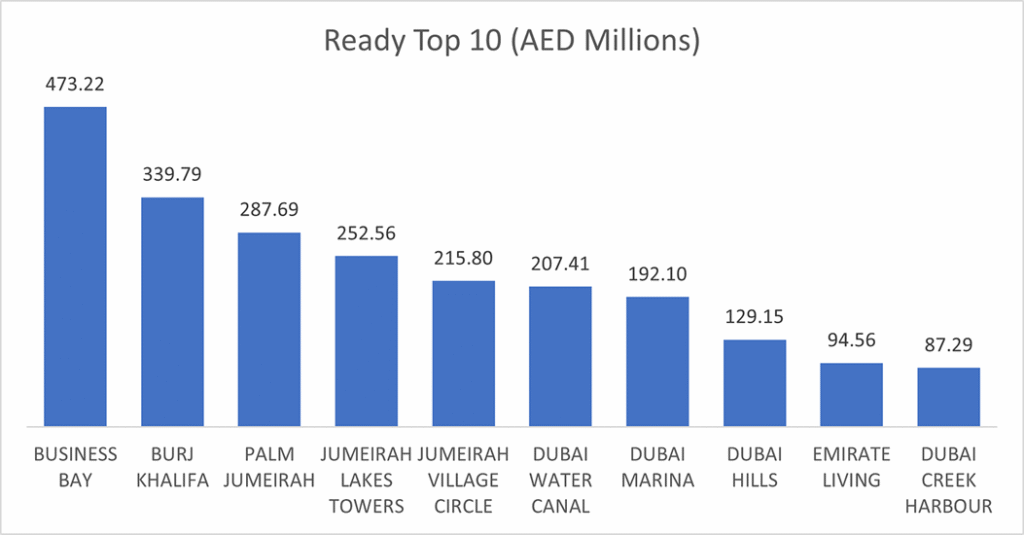 The top 10 areas combined totaled AED 2.28 billion (59.8% of total ready transactions).