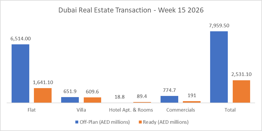 Total trading reached AED 10.49 billion across 4,835 transactions in Week 15, compared with AED 10.59 billion and 4,636 transactions in the prior week. That means weekly value edged down by 0.9%, while transaction count increased by 4.3%, pointing to a busier market but with a lower average ticket size.