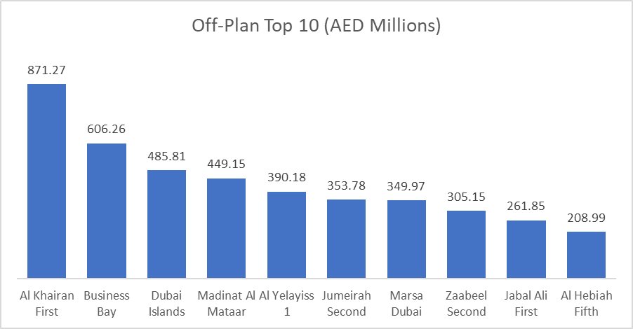 The top 10 off-plan areas generated AED 4.28 billion, equal to roughly 53.8% of all off-plan value. Al Khairan First led the market with AED 871.3 million, or about 10.9% of total off-plan trading, followed by Business Bay and Dubai Islands.