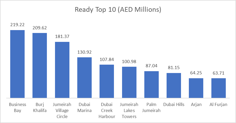 The top 10 ready areas generated AED 1.25 billion, representing around 49.2% of all ready-market value. Business Bay ranked first at AED 219.2 million, narrowly ahead of Burj Khalifa at AED 209.6 million, showing continued concentration in established urban, high-liquidity locations.