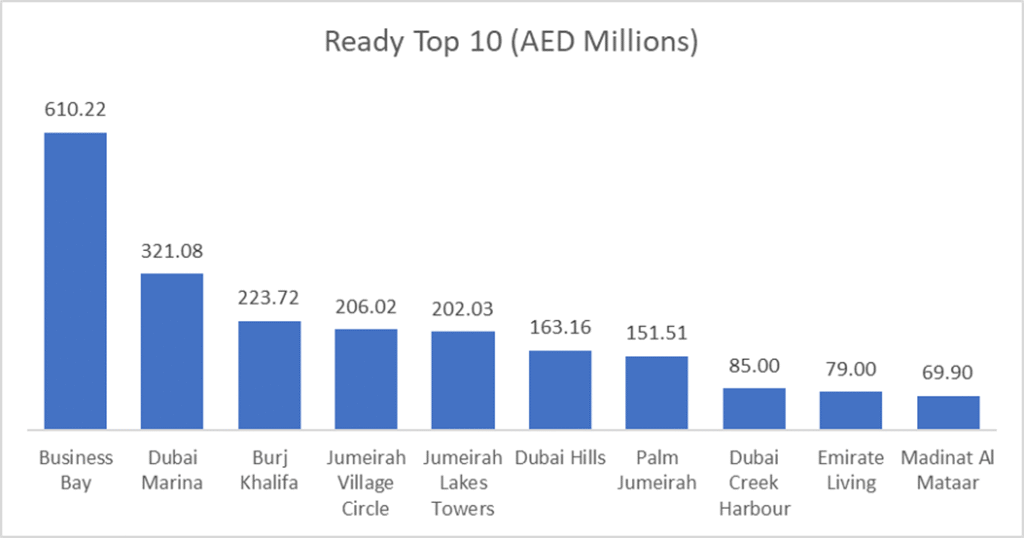 - Where money flowed: Business Bay topped both segments by value, with strong secondary flows in Dubai Marina (Ready) and Jumeirah Second/DMCC-EZ2 (Off-Plan).