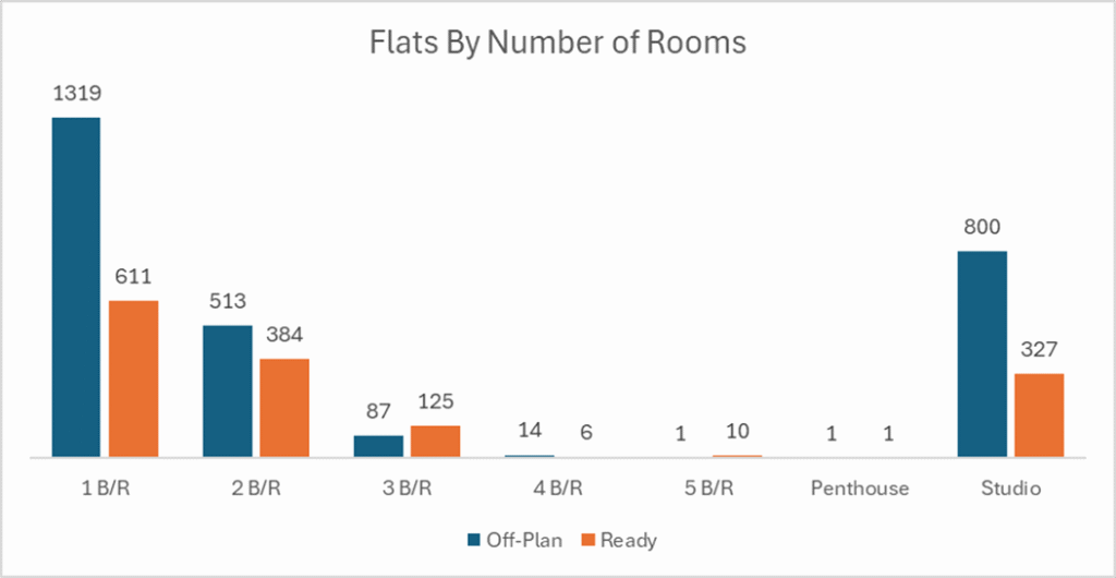 - Mix stable: Off-plan Flats remained the engine (84.2% of off-plan), while Ready Flats formed two-thirds of ready activity (66.9%).
