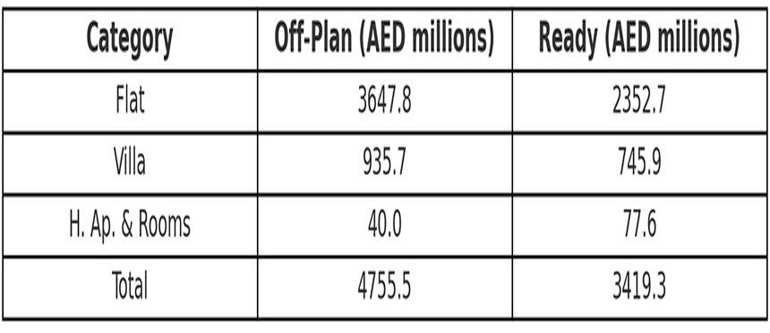 • Flats dominated this category with AED 3.65 billion, comprising 76.7% of off-plan transactions.