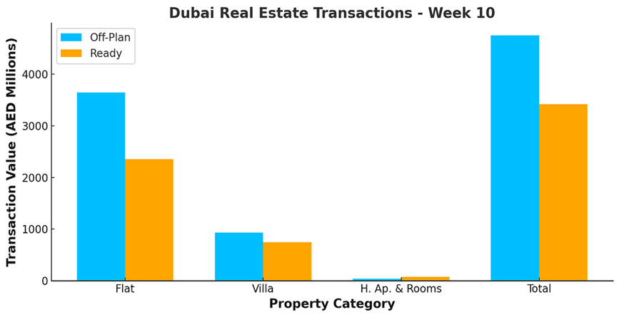 Dubai’s real estate market recorded total transactions valued at AED 8.17 billion in Week 10, marking a decrease of approximately 11.1% compared to the previous week’s total of AED 9.2 billion. Despite this weekly downturn, the market showcased robust performance across various segments.