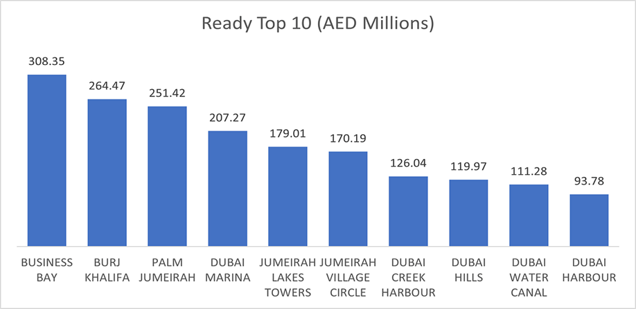 The top active areas for ready properties combined totaled AED 1.83 billion, contributing 53.6% to the ready market segment.
