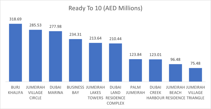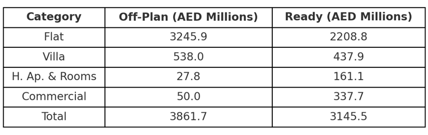 • Flats: AED 2.21 billion (70.2% of ready transactions).
