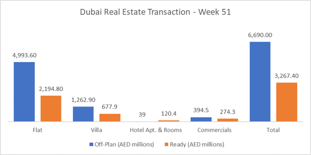 The total real estate transactions in Dubai for Week 51 was AED 10.0 billion and 4,721 transactions. Off-Plan contributed 67.2% or 6.7 billion, while Ready properties contributed 32.8% or 3.3 billion.