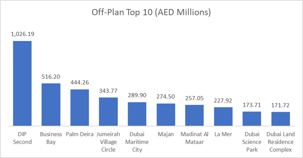 Top 10 areas captured AED 3.7B (≈55.7% of Off-Plan value).