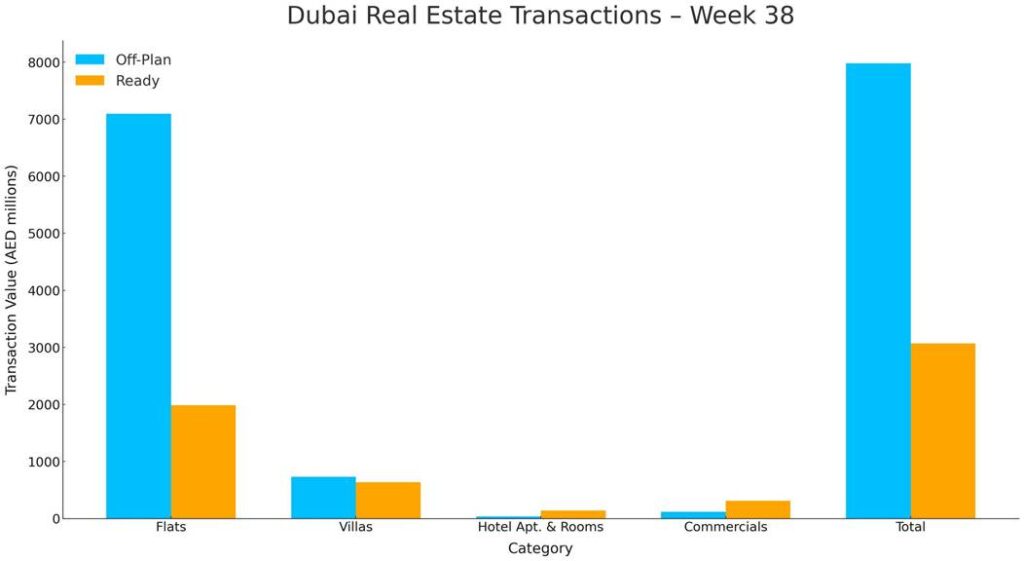On week 38, the total trading reached AED 11.04 billion across 5,229 transactions, a 35.2% rise in value and 14.7% increase in activity versus last week (AED 8.17 billion, 4,558 deals). Off-plan dominated by value with a 72.2% share (AED 7.98 billion), while ready assets contributed 27.8% (AED 3.07 billion).