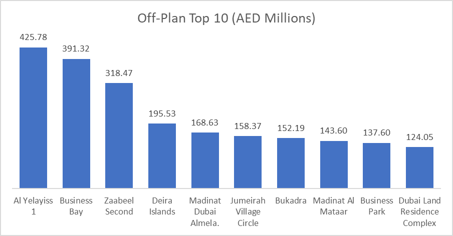 The top 10 off-plan areas generated AED 2.22 billion, equal to 55.5% of total off-plan value, led by Al Yelayiss 1, Business Bay, and Zaabeel Second.