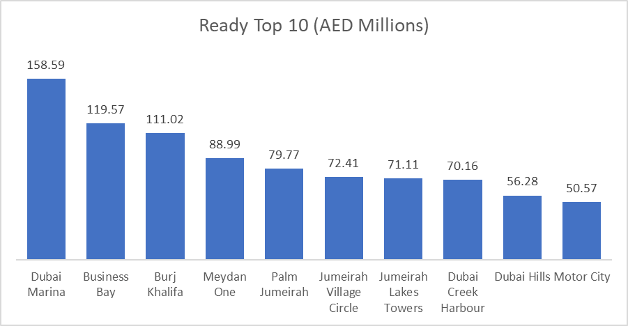 The top 10 ready areas generated AED 878.5 million, or 48.0% of total ready value, led by Dubai Marina, Business Bay, and Burj Khalifa.