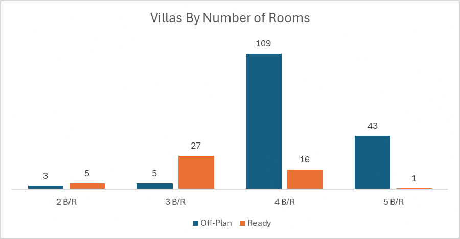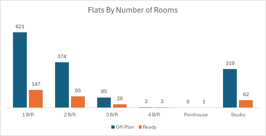 The ready market was also led by flats, which made up 66.6% of ready value, followed by villas at 22.6%. Commercials contributed 7.5%, while hotel apartments and rooms accounted for 3.3%. Unlike off-plan, the ready segment showed a much heavier financing component: sales contributed 53.2% of ready value, while mortgages represented a substantial 43.6%, pointing to strong financed end-user and investor activity in completed stock. Gifts contributed 3.2%.