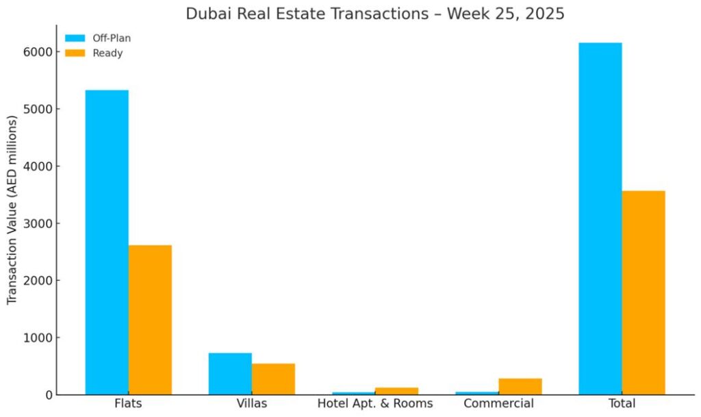 In Week 25 of 2025, the total transactions reached AED 9.72 billion, a 9.2% increase compared to AED 8.90 billion recorded last week. The number of transactions also rose to 4,907 deals, up from 4,060 in the previous week, marking a strong increase in market activity across both off-plan and ready segments.