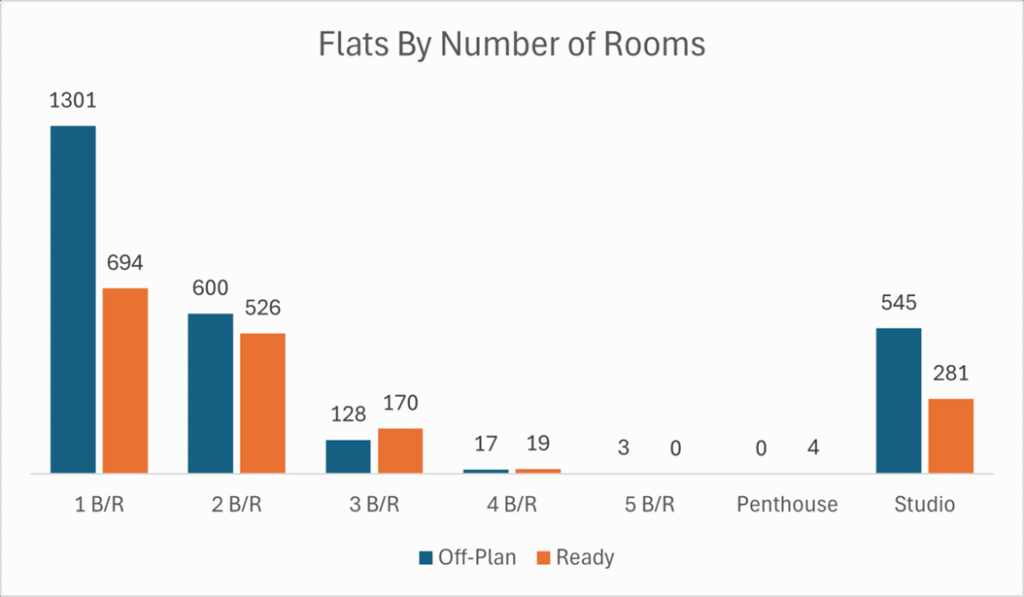 Flats remained the dominant off-plan asset class, accounting for over 86% of the segment’s value. Villas followed at 11.9%, while commercial units and hotel inventory together made up under 1.6%.