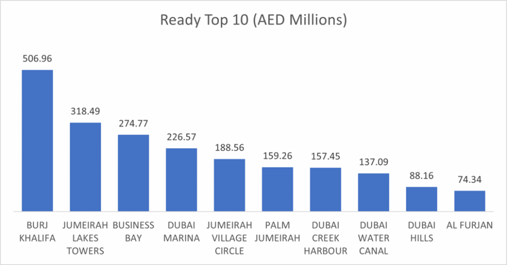 The top five areas generated AED 1.52 billion, or 42.5% of the ready properties transactions value.