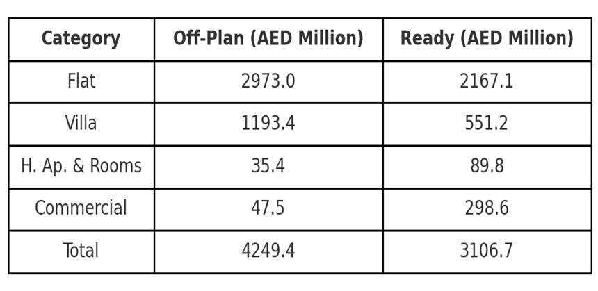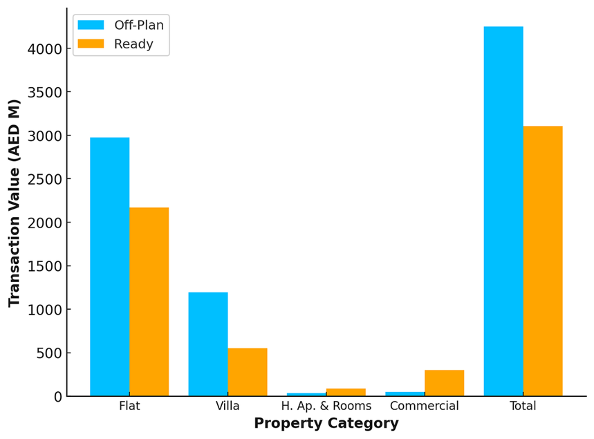 • Flats led the category with AED2.97 billion, contributing 69.9% of all off-plan transactions.