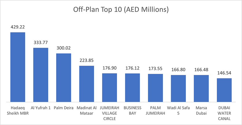 Among the most active areas in off-plan transactions, Hadaeq Sheikh Mohammed Bin Rashid led with AED429.2 million, followed by Al Yufrah 1 (AED333.8 million) and Palm Deira (AED300 million). Other notable contributors included Madinat Al Mataar (AED223.9 million) and Jumeirah Village Circle (AED176.9 million).