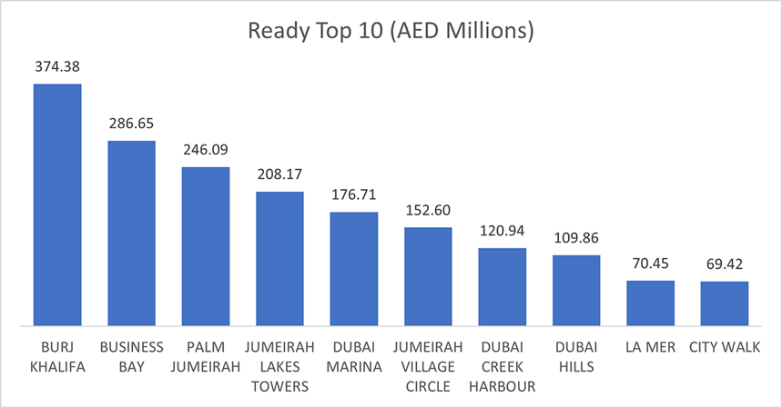 For ready transactions, Burj Khalifa emerged as the top-performing area with AED374.4 million in sales. Business Bay followed with AED286.6 million, while Palm Jumeirah recorded AED246.1 million. Other high-performing locations included Jumeirah Lakes Towers (AED208.2 million), Dubai Marina (AED176.7 million), and Dubai Creek Harbour (AED120.9 million).