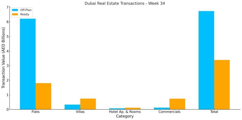 The total real estate transactions in Dubai for Week 34 was AED 10.12 billion and 5,188 transactions. Off-plan contributed 66.6% or 6.7 billion, while Ready properties contributed 33.4% or 3.4 billion.