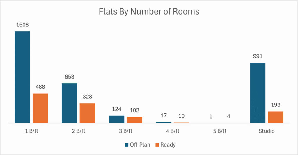 Off-plan activity was overwhelmingly driven by flats (92.3%), with modest contributions from villas (4.9%) and small tails from commercial and hospitality.