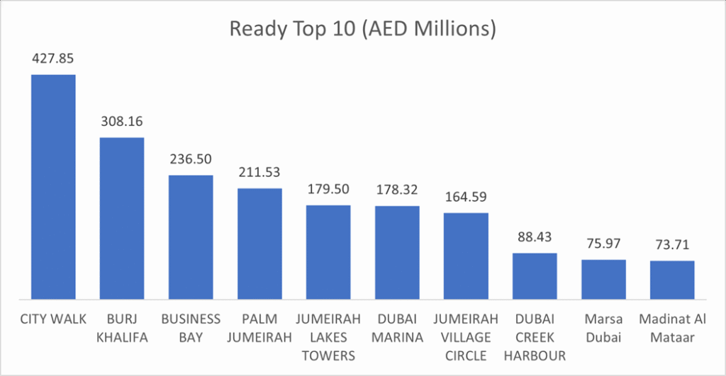 The top 10 ready areas captured 57.4% of ready value. City Walk (12.6% of ready) led the board, with Burj Khalifa (9.1%) and Business Bay (7.0%) close behind, signaling demand concentration in prime, amenity-rich mixed-use districts.