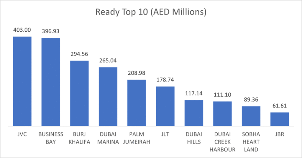 The top 10 districts together delivered AED 2.13 billion, or 59.9 % of ready trading.