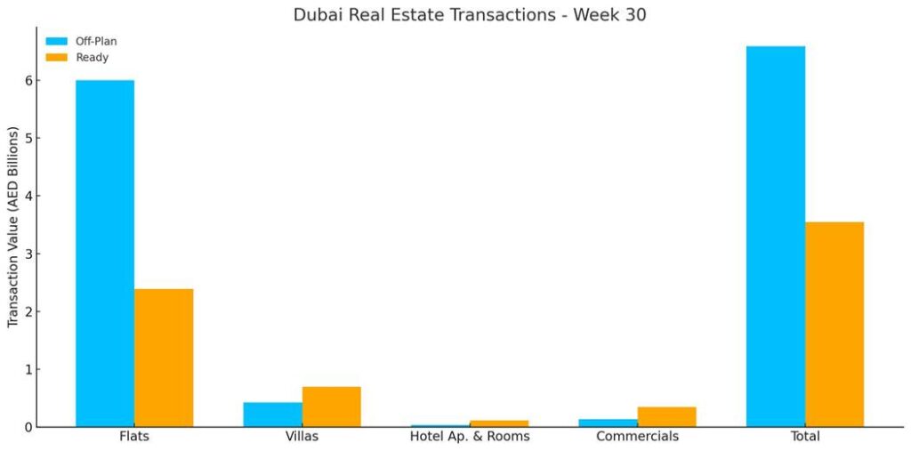 The total real estate transactions in Dubai for Week 30 was AED 10.14 billion and 4,894 transactions. Off-plan contributed 65.0% or 6.59 billion, while Ready properties contributed 35.0% or 3.55 billion.