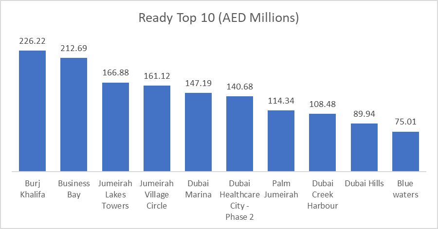 The top 10 ready areas traded AED 1.44bn, accounting for 48.5% of ready value (and 12.4% of total weekly trading), with prime locations (Burj Khalifa, Business Bay, Dubai Marina) leading