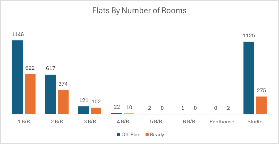 The ready segment stayed apartment-heavy, but with a stronger commercial share than off-plan, pointing to more diverse end-user and investment activity in completed stock.