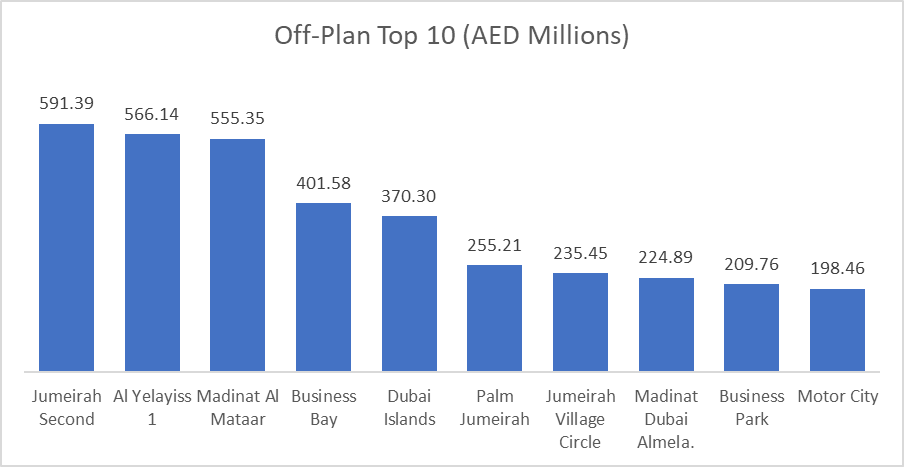 The top 10 off-plan areas generated AED 3.61B, equivalent to 53.5% of total off-plan value, underlining how concentrated activity was in a handful of launch-heavy districts. Jumeirah Second led the market with AED 591.4M, followed closely by Al Yelayiss 1 and Madinat Al Mataar, confirming that high-value master developments continued to attract the bulk of capital.