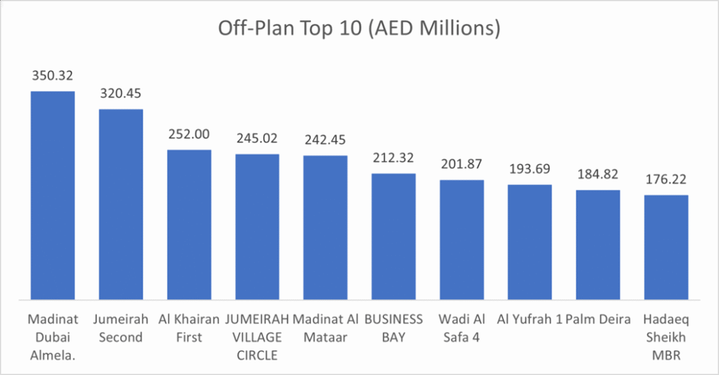 These five communities alone accounted for AED 1.41 billion, or 28.8% of all off-plan transactions this week.