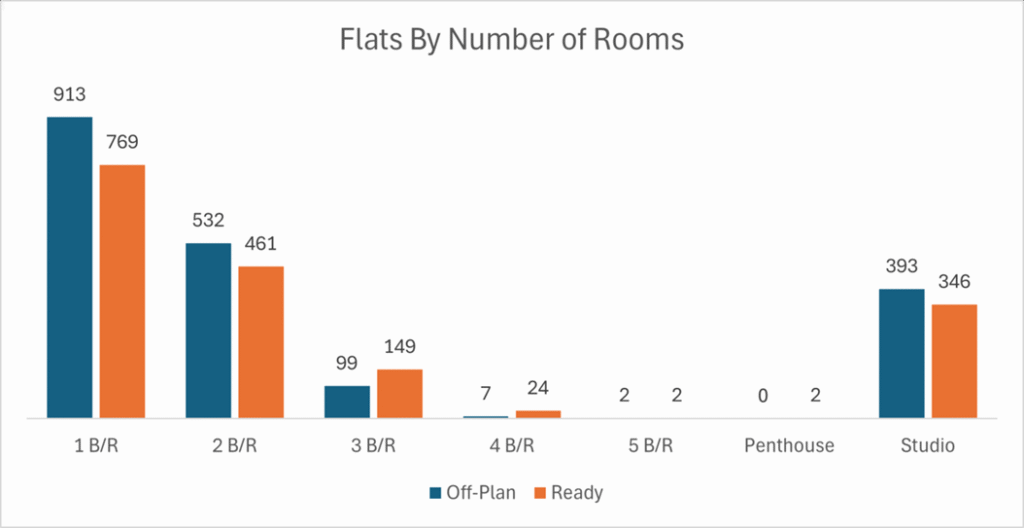 Flats again led the ready market, comprising nearly 70% of value, while villas added 19.5% and commercials captured a notable 8.6%.