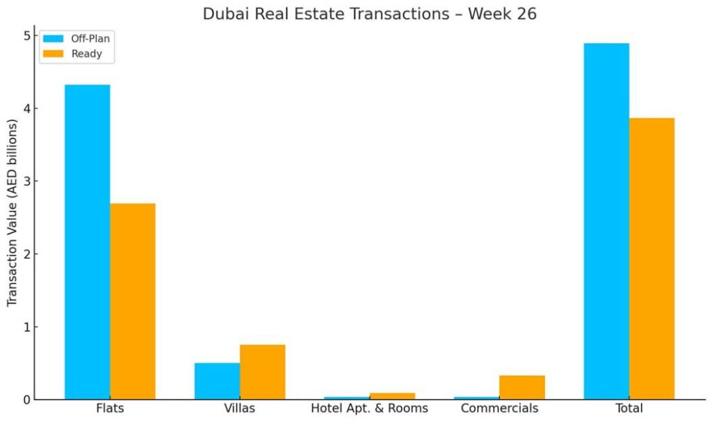 The total real estate transactions in Dubai for Week 26 was AED 8.76 billion and 4,298 transactions. Off-plan contributed 55.9% or 4.89 billion, while Ready properties contributed 44.1% or 3.87 billion.