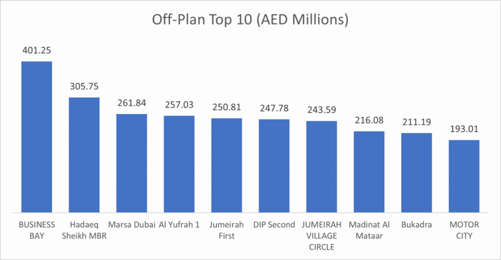 These five communities together represented AED 1,476,694,322, or 25.9 % of all off-plan transactions.