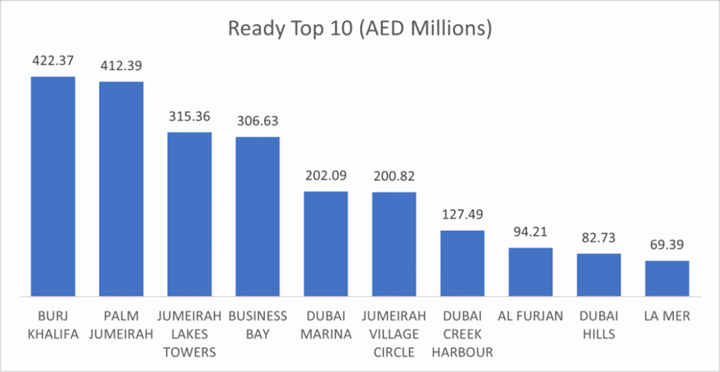 Flats led the ready market at 65.2 %, followed by villas at 17.5 % and hotel/commercial units at 17.4 %. It’s worth mentioning that the big jump in Hotel Appartments & Rooms transactions value was due to the sales of the Bonnington Tower Hotel & Residence for AED 157.2 million.
