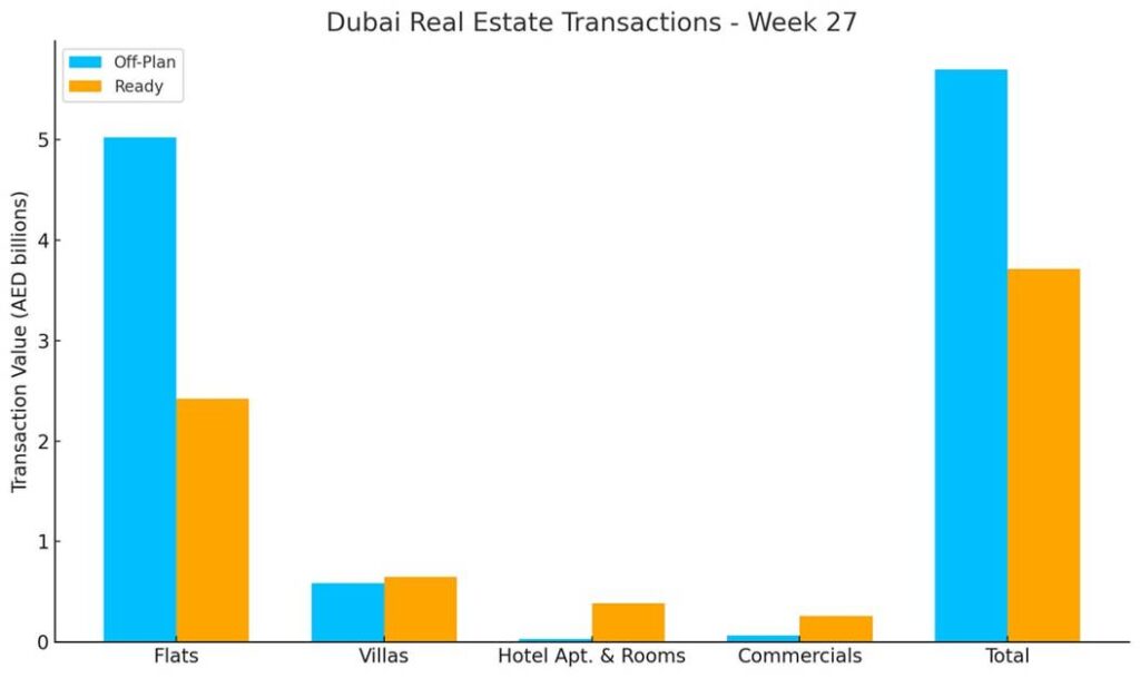 The total real estate transactions in Dubai for Week 27 was AED 9.42 billion and 4,632 transactions. Off-plan contributed 60.6% or 5.70 billion, while Ready properties contributed 39.4% or 3,71 billion.