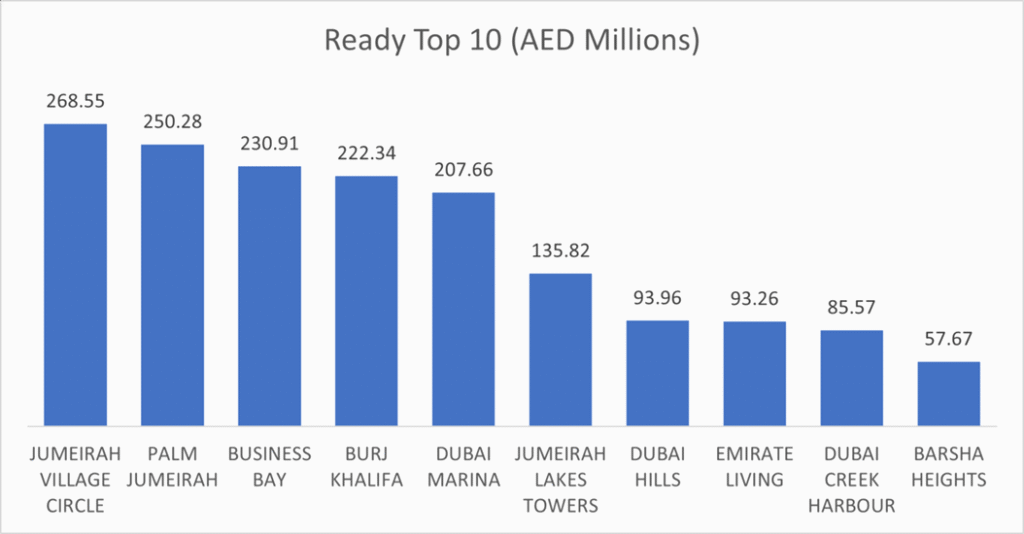 The ten most active ready areas together transacted AED 1.65 billion, or 58.7% of the ready segment.