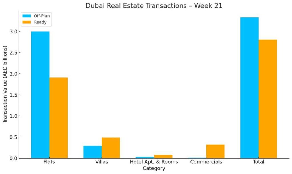 In Week 21, Dubai’s real estate market recorded a total transaction value of AED 6.14 billion across 3,906 deals, marking a 45.1% drop from last week’s AED 11.16 billion (3,906 transactions). Off-plan properties accounted for AED 3.33 billion (54.3% of volume), while ready assets contributed AED 2.80 billion (45.7%). It’s worth mentioning that last week had 2 days off for Eid Al Adha.